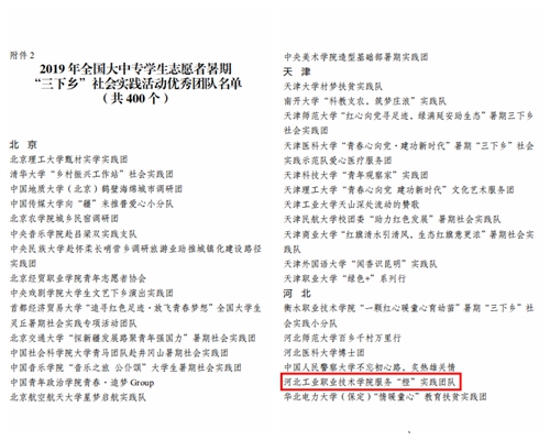 为推进“三下乡”社会实践活动持续深入开展,在实践育人中发挥更加突出的作用,今年9月开始,共青团中央在全国范围内,对2019全国大中专学生志愿者暑期“三下乡”社会实践活动开展总结通报工作。经过基层申报、省级团委审核推荐、组织评议等环节层层选拔,日前,共青团中央发出总结通报结果公示,我院计算机技术系“服务橙”实践团队,荣获2019年全国大中专学生志愿者暑期“三下乡”社会实践活动“优秀团队”。