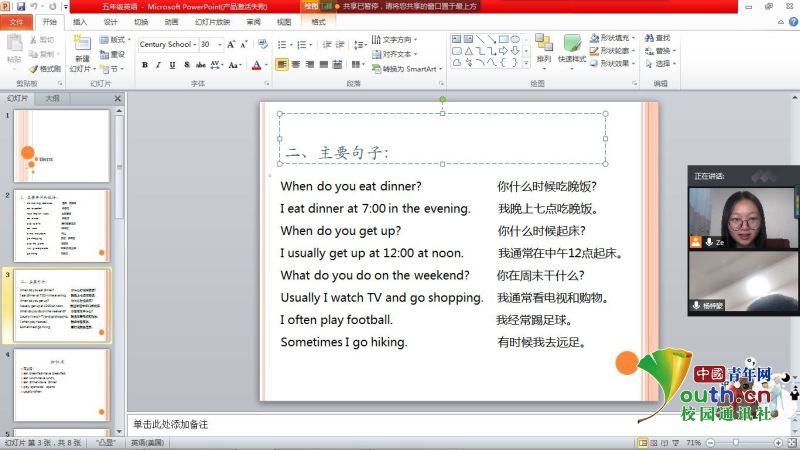 疫情无情人有情,隔离病毒不隔爱。在本次“线上支教”的特别课堂中,即使志愿者与学生相隔千里,但每一位学生课上态度端正,专心致志,积极发言,全身心地投入到课堂上。本次实践活动,通过调查问卷志愿者了解到学生的需求,因此周末开设语、数、英、课业辅导、思想建设、健康知识及安全知识拓展等课程。而工作日则辅导家庭作业、巩固当天所学、预习新内容。课前,志愿者根据学生的不同进度制作课件。课上,学生积极配合志愿者,善于思考、敢于发表自己的见解。课后,志愿者把上课过程中的录屏和所用课件发送给学生及家长,便于学生温故知新,也让家长对孩子的学习情况加以了解。