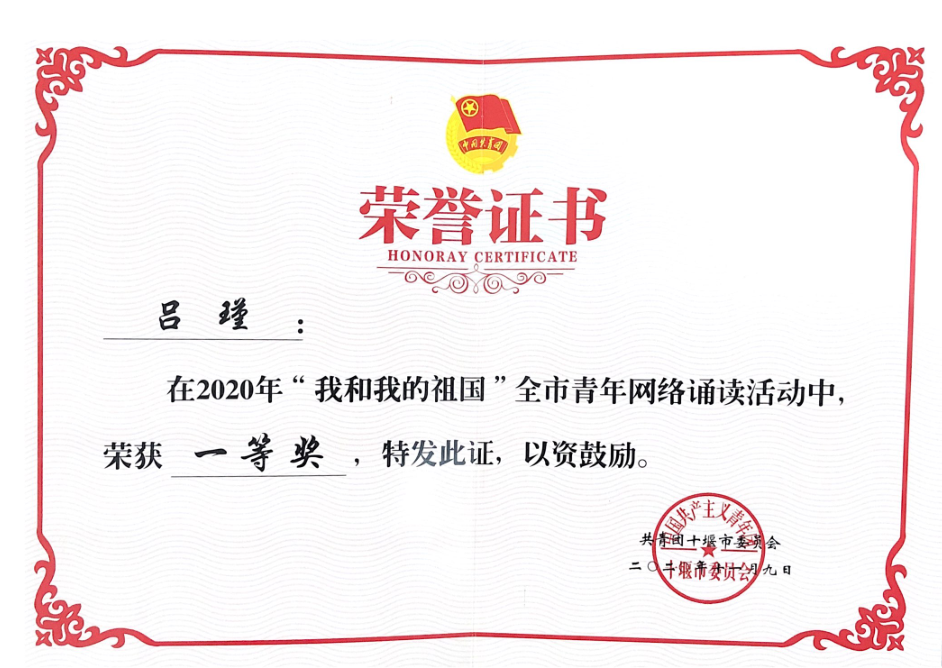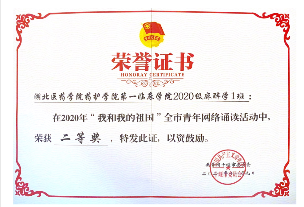 在共青团十堰市委员会举办的《我和我的祖国》演讲比赛中,我校学子再获佳绩,来自第二临床学院2019精神医学1班的吕瑾以《我的祖国》获得一等奖,第一临床学院药护2020麻醉学1班的《以青春之我,建青春之国》和药护2020麻醉学2班的《青丝与白发共勉,赞我中华之蓬勃》分获得二等奖和三等奖。