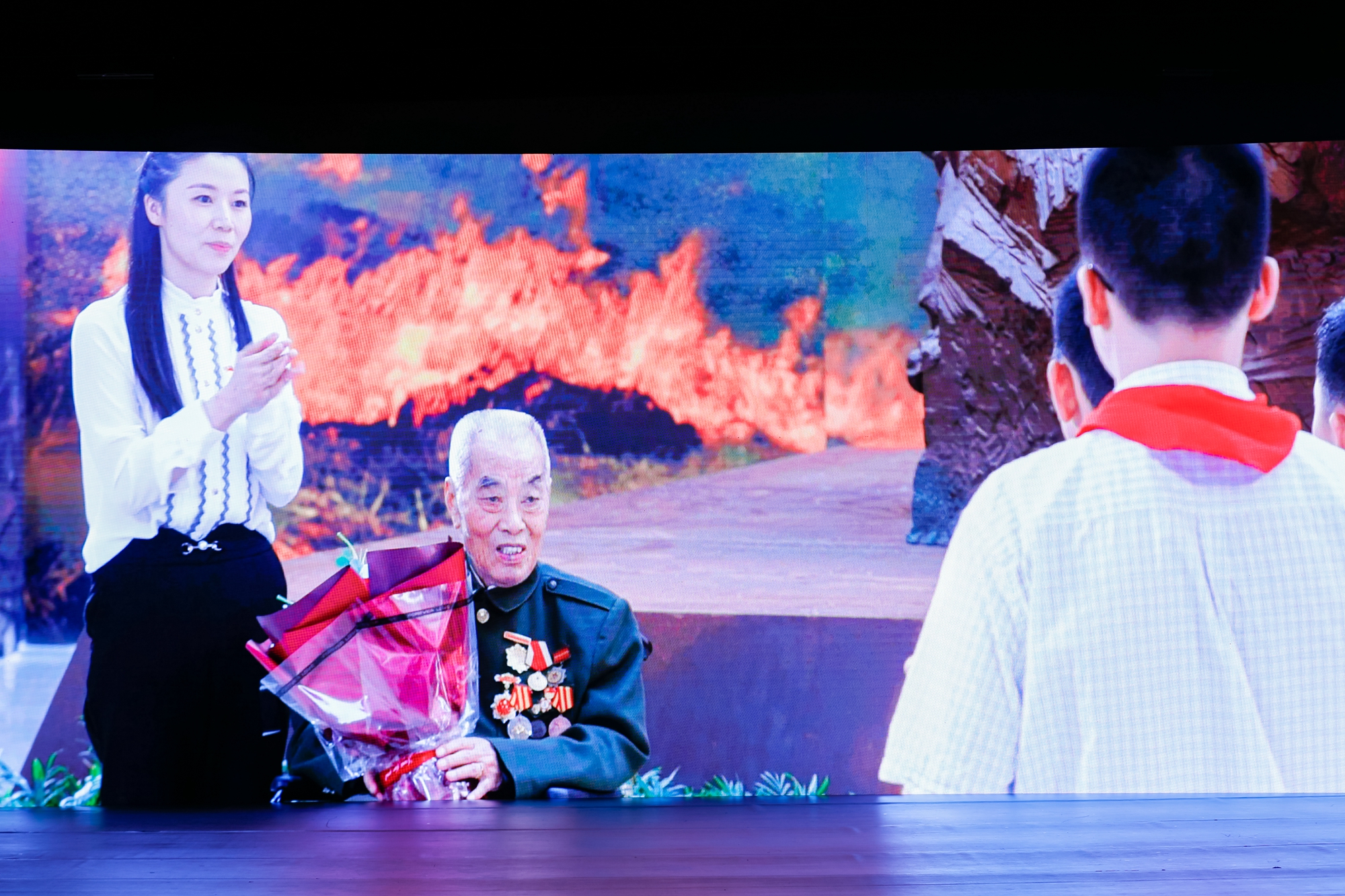 90多岁高龄的新四军老战士宋强为同学们讲述新四军战士们保家卫国的英勇故事
