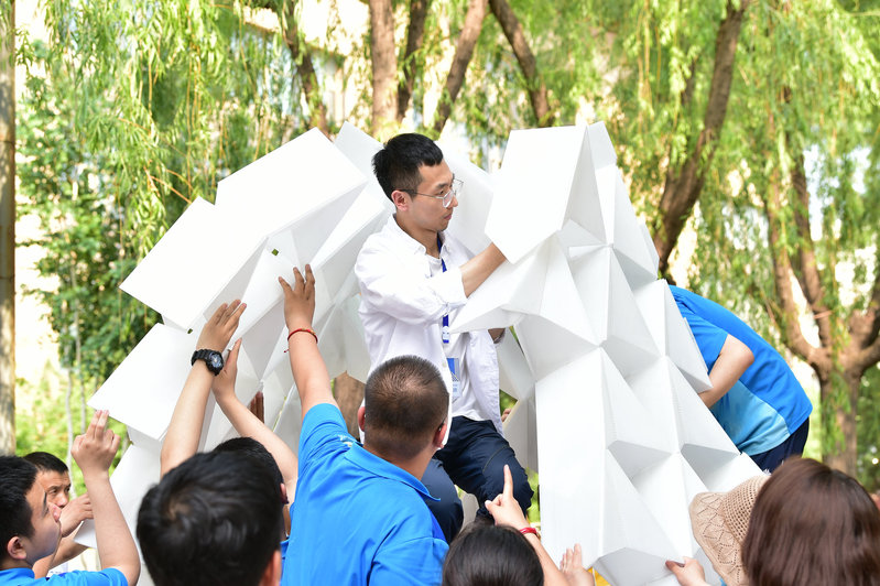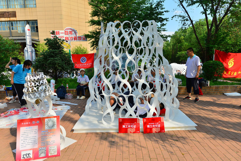 建造节是建筑学院组织承办的大型精品实践类竞赛之一,旨在通过团队合作、动手实践的方式激发学生的创造潜能,加强对空间建构的理解,共分为两个板块:百年校园现场建造与百所高中校园建造。建筑学院一、二年级25组大学生队伍,哈尔滨市第三中学、大庆市实验中学、牡丹江市第一高级中学、东北师范大学附属中学等11所高中队伍参赛,另有山东省实验中学、四川省成都树德中学等14组高中队伍在自己的校园内远程参赛。