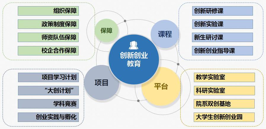 作为全国首批深化创新创业教育改革示范高校、全国双创示范基地、全国深化创新创业教育改革特色典型经验高校、全国高校实践育人创新创业基地,学校高度重视大学生创新创业教育工作,持续深化创新创业教育改革,以培养一流拔尖创新人才为目标,秉持“改革创新、开放融合、共建共享”的创新创业教育理念,构建了课程、项目、平台、保障“四位一体”创新创业教育体系,建立了“学校统一领导、校院两级互动”的双创教育工作机制,实施了“教赛研一体、科教创贯通、产学研协同、多方联动”的融合式双创教育培养模式。