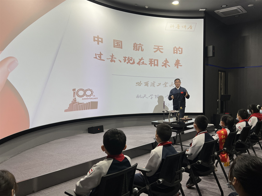 10月29日,由共青团黑龙江省委员会、黑龙江省社会科学界联合会、少先队黑龙江省工作委员会共同主办的“学习二十大,争做好少年”省级红领巾讲解员科普实践活动暨龙江讲坛航天公开课在我校航天馆举行。航天学院李传江教授结合党的二十大报告中提到的航天强国战略,从人造卫星、载人航天、月球探测、火星探测4个方面讲解了我国航天事业的发展历程与辉煌成就,以通俗易懂的语言为青少年上了一堂别开生面的航天科普课。