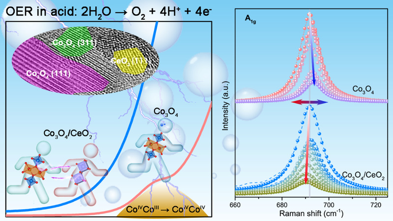 研究人员通过设计纳米复合材料的策略,利用CeO2对Co3O4进行改性。尺寸为~ 5 nm的CeO2与~ 9.7 nm的Co3O4形成紧密结合的界面,从而扩大两相界面处的电子调控作用,使其局域结构以及氧化还原特性发生改变。利用动力学同位素效应(KIE)、pH相关性和温度相关性分析对Co3O4/CeO2纳米复合催化剂进行了精细的电化学表征,并结合原位Raman和非原位X射线近边吸收谱(XAS)的结构表征,清楚地揭示了催化剂的局域结构特征及其在OER过程中的动态演化过程变化。研究发现:纳米CeO2的引入为Co3O4创造了更有利的局域成键环境,使得Co3O4表面的CoIII物种容易被氧化为OER活性CoIV物种,并抑制了该过程中的电荷积累。该过程显著提高了酸性OER催化活性,过电位减低了84 mV,使得Co3O4/CeO2成为目前最好的非贵金属酸性OER催化剂之一。同时,稳定性分析揭示了Co3O4/CeO2复合结构在具有优异催化活性的同时能保持较好稳定性,打破了对酸性OER中催化活性与稳定性折衷关系的认知。该项研究不仅利用储量丰富的过渡金属设计出了高效的酸性OER催化剂,也为其它反应的催化剂设计提供的新的策略。