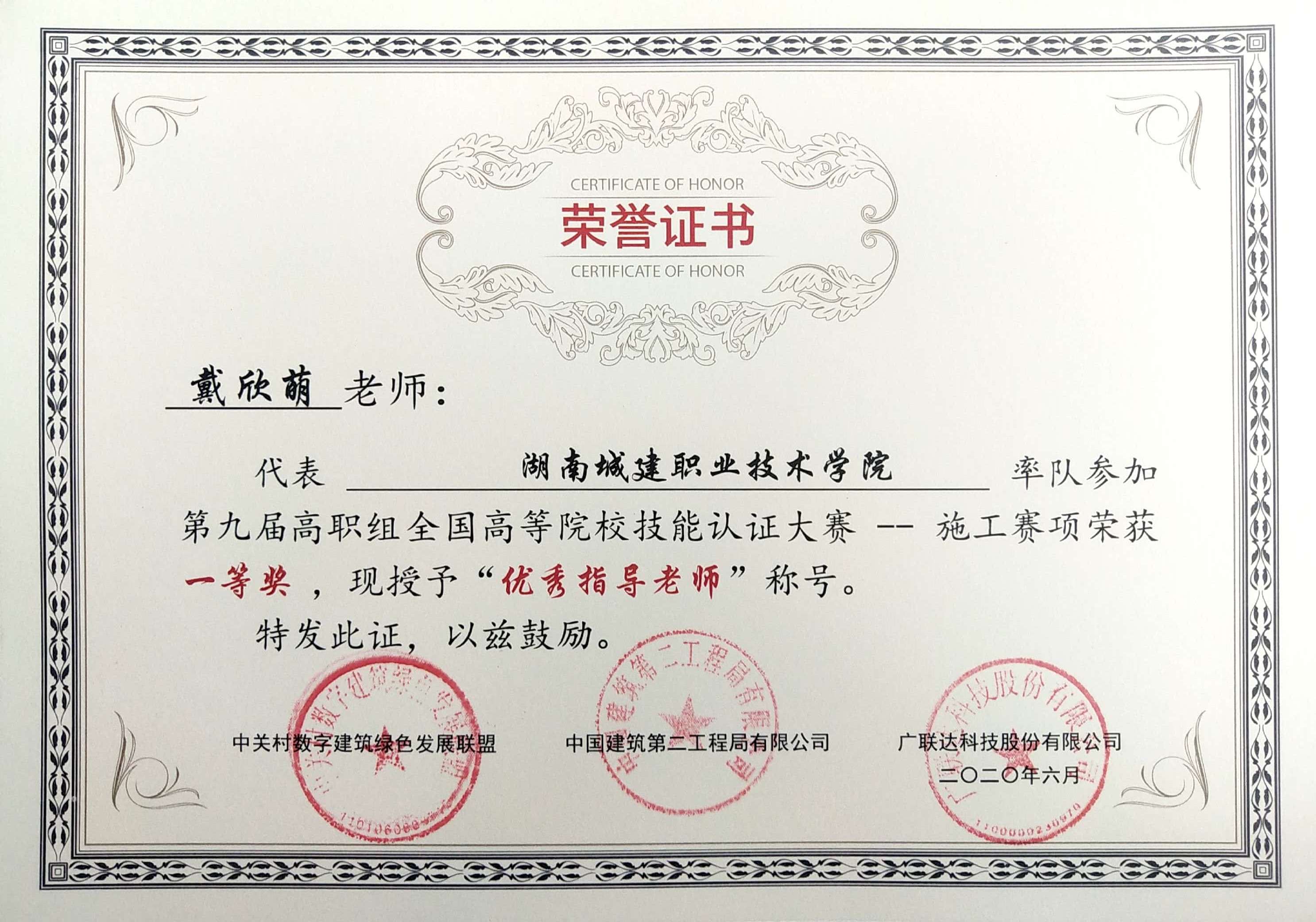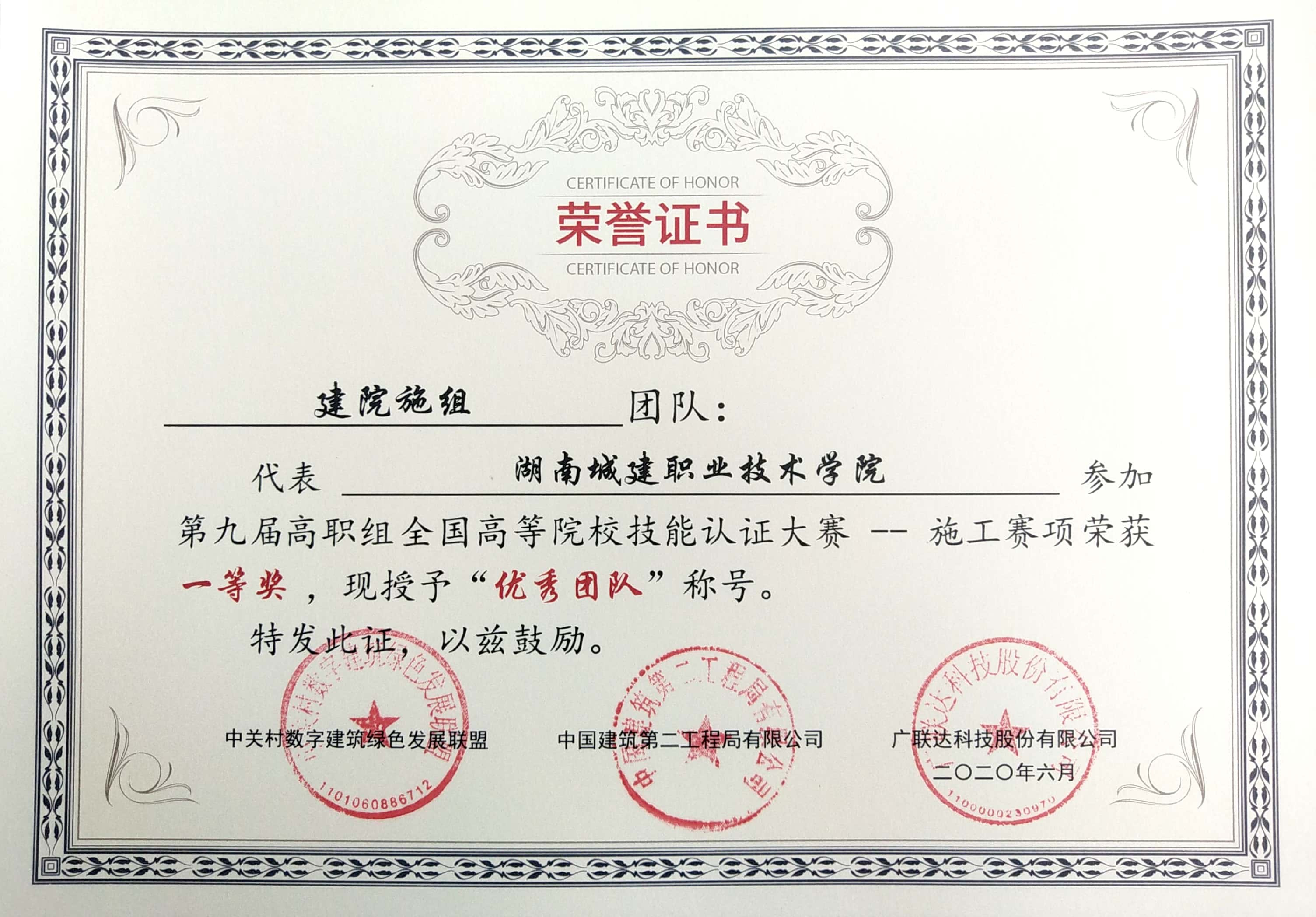 本次大赛分为工程造价和施工组织两个赛项,共有来自全国663支队伍参加,其中本科院校 352支,高职院校311支。我系陈枭、刘林涛、钟锦旺等15名同学组成的“建院施组”团队荣获施工组织赛项全国一等奖,指导老师戴欣萌、陆婷荣获“优秀指导老师”“最佳教学能手奖”“最佳实施奖”荣誉称号,陈枭等9名同学以总分并列湖南省第一的成绩荣获“省前三”荣誉称号。
