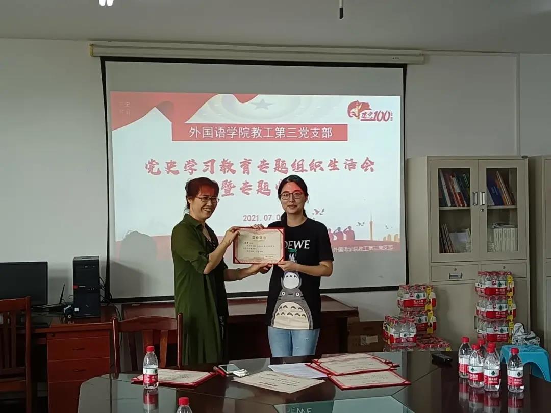 会议的最后,肖艳玲副院长和支部书记李双梅同志为教工第三党支部获得“优秀共产党员”、“‘学习强国’学习达人”、“党员先锋岗”和“党员示范课”等称号的党员教师进行了颁发证书。