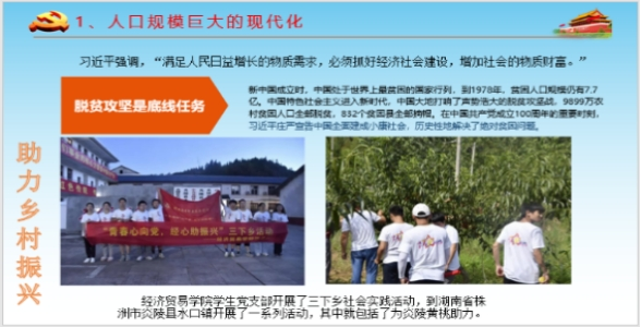 在学习中国式现代化的五大特征时,主持人以我支部组织举办的一系列活动为例号召大家积极参与中国式现代化新道路建设。例如暑期三下乡社会实践活动中为炎陵黄桃助力,引导大学生为乡村振兴贡献才智;走进湘仪社区养老中心开展的“青春伴夕阳”活动,传承尊老敬老的传统美德,加强了当代大学生的精神文明建设,推进物质文明与精神文明相协调的现代化。
