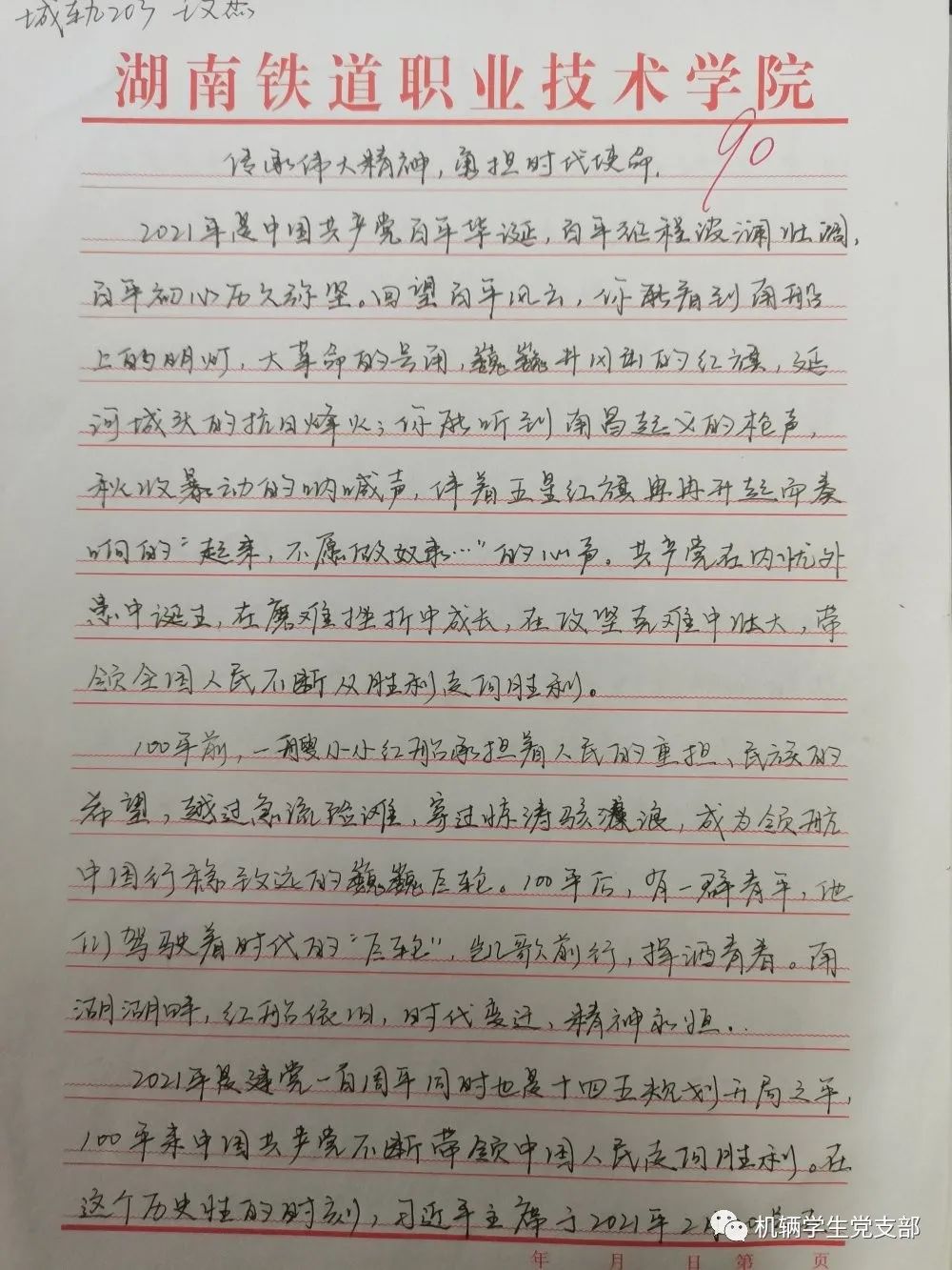 为庆祝中国共产党成立100周年,深情回顾党的奋斗历史,热情讴歌党的光辉历程,引导广大师生继承和发扬党的光荣传统和优良作风,坚定理想信念,凝聚奋斗共识,机辆学院学生党支部面向机辆学院入党积极分子、发展对象及全体20级同学开展了“薪火相传铸党魂,忠诚护航开新篇”主题征文比赛。