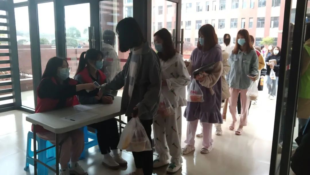 25日,志愿者在2栋、4栋和5栋宿舍门口有序地组织、协调同学们出入宿舍楼,并且及时地进行体温登记和测量。
