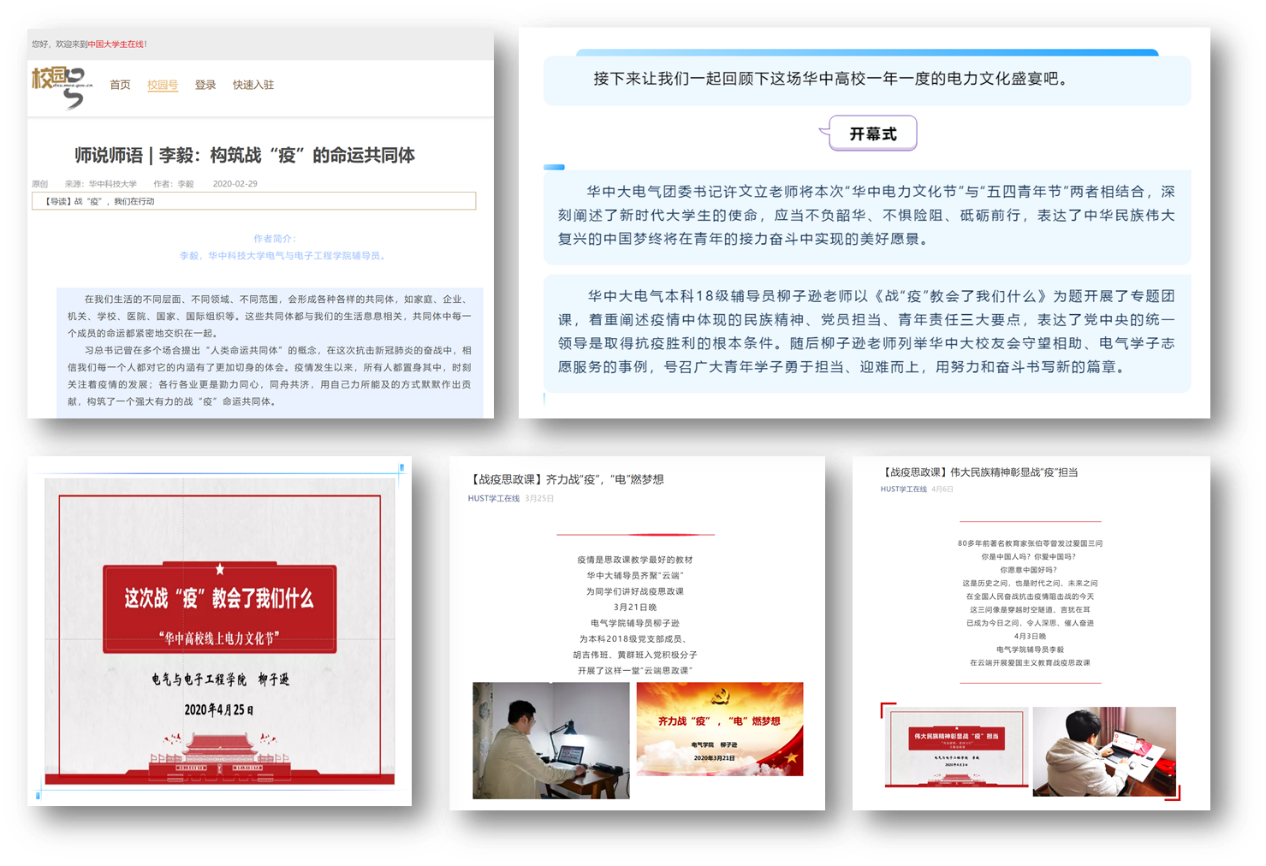 比如,辅导员柳子逊在以《战“疫”教会了我们什么》为题的专题团课上,阐述了疫情中所展现的民族精神、党员担当和青年责任,列举华中大校友会守望相助及电气学子志愿服务的事例,号召广大青年学子要具有勇于担当、敢于奉献的精神品质;在我院与武汉大学电气学院合办的华中电力高校文化节上,辅导员许文立结合专业特色开展了线上特色团课,阐释了新时代大学生的使命,鼓励我院学子不负韶华、砥砺前行。