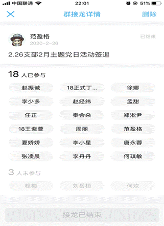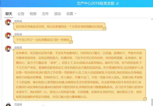 最后范盈格同志作了总结发言,并表示希望大家保重身体,继续关注疫情动向,发挥一名党员的积极作用。本次活动支委通过群接龙签到签退、QQ群开会、学习强国平台学习系列讲话等形式,召开支部会议以及发挥专业优势投身疫情防控当中去。