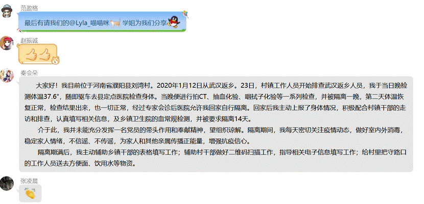 我支部何琪敏同志的父母作为医护人员,认真履职,战斗在当地抗击疫情的第一线,何琪敏同志积极支持父母,为父母做好后勤保障工作。周丽同志积极发挥党员的作用,主动联系村委会上报自己由武汉返乡的事实,定时汇报体温和其他身体状况,并向村主任反映当时村里人对疫情防护意识不高(例如不戴口罩、办酒席、人群聚集等)、农村地区疫情宣传监督不到位等情况,并积极配合相关工作。同时每天向学校中心、导师和同学报告每日身体情况。秦会朵博士在隔离期间,每天密切关注疫情动态,做好室内外消毒,稳定家人情绪,不信谣、不传谣,为家人和其他亲属传播正能量,增强抗疫信心。隔离期满后,她主动辅助乡镇干部的表格填写工作;辅助村干部做好二维码扫描工作,指导相关电子信息填写工作;给村里把守路口的工作人员送去方便面、饮用水等物资。