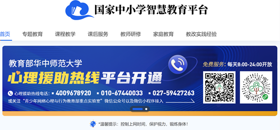 2022年3月28日,教育部部长怀进鹏在国家智慧教育平台启动仪式上强调:“要坚持优先服务师生和社会急需,支撑抗疫大局。为抗疫一线师生打造一所永远在线的网上课堂,加强抗疫知识学习、心理健康教育和引导,提供更加坚强有力的保障。”并宣布国家智慧教育公共服务平台正式上线。为更好地为抗疫赋能,打好与不良心理和情绪斗争的“心理防御战”,教育部华中师范大学心理援助热线平台接入国家智慧教育平台,国家中小学智慧教育平台在首页推荐了教育部华中师范大学心理援助热线平台。