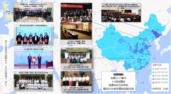 (1)优质资源辐射全国。课程覆盖31个省市,1108所高校。2019年与牛津、剑桥等全球知名高校就中英高校心理健康教育教学交流研讨。2018年吉林大学承办千人规模学术会议,围绕成果做论坛报告。2016年以来清华大学、中山大学、上海交通大学等30余所各类高校心理中心相继到吉林大学调研交流心理育人经验模式。