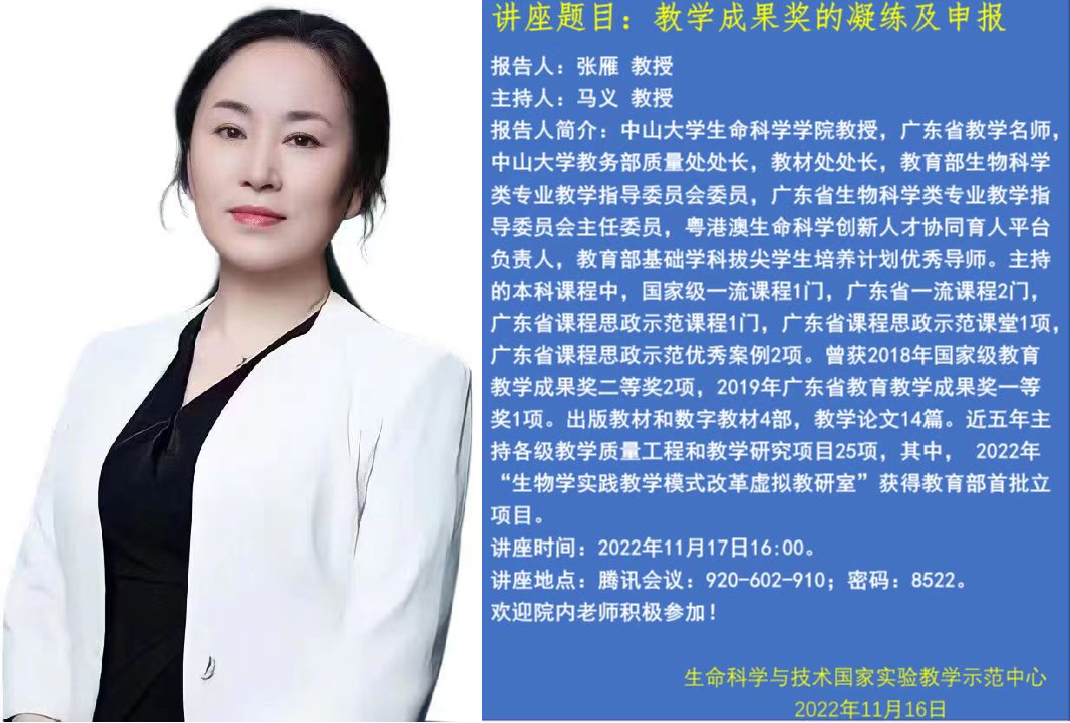 2022年11月17日下午,生命科学与技术国家实验教学示范中心邀请中山大学张雁教授作题为“教学成果奖的凝练及申报”讲座,我院共40余名教师参加视频讲座。讲座由教育部“双带头人”教师党支部书记、示范中心主任马义教授主持。