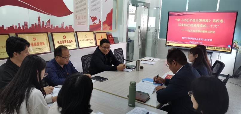 会上,首先由无人机支部书记李笑瑜同志带领大家共同学习了《习近平谈治国理政》第四卷,强调大家要切实用习近平新时代中国特色社会主义思想武装头脑、指导实践、推动工作,不断汇聚团结奋斗、勇毅前行的磅礴力量,不断增强进行伟大斗争的意志和本领。青年党员教师杨珍书、张伶俐结合工作实际发表感言,在喜迎二十大之际,作为新时代的青年教师,要时刻以实现中华民族伟大复兴为己任,增强做中国人的志气、骨气、底气,不负时代,不负韶华,不负党和人民的殷切期望!
