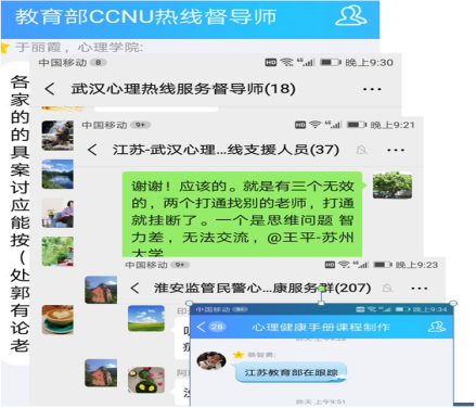 疫情发生之后,各种力量相继驰援武汉、驰援湖北,其中就有一条看不见的生命线:心理热线,与此同时,全国广大民众和学生也亟需心理疏导。为此,周朝英、黄雅静、许洁等心理学党员教师积极响应有关组织的号召,立即行动起来,志愿参与各种心理援助工作。例如,周朝英老师参与中国心理学会临床注册系统针对武汉的心理援助工作,承担武汉心理医院热线(心心语热线)接线工作;承担教育部华东师大热线接线心理咨询师的支持、督导工作;持续为江苏省公安厅心理热线及淮安监管系统开展心理援助工作;参与江苏省教育厅大学生有关疫情的心理健康手册音频材料的撰写与录制。再例如,黄雅静老师在广泛宣传江苏省心理援助热线和区心理援助热线等心理支持渠道的基础上,开通学院QQ心理支持在线服务,为本校师生进行心理服务。