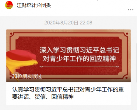 青年是国家的未来、民族的希望。党的十八大以来,习近平总书记亲切关怀青年发展、高度重视青年工作,多次出席青年活动,与青年座谈交流,给青年回信演讲,提出了一系列关于青年工作的重要论述。为深入领会学习习近平总书记对青少年工作的重要讲话、贺信、回信精神,江西财经大学统计学院党委组织各党支部认真学习、宣传,统一思想、提高认识、凝聚力量。