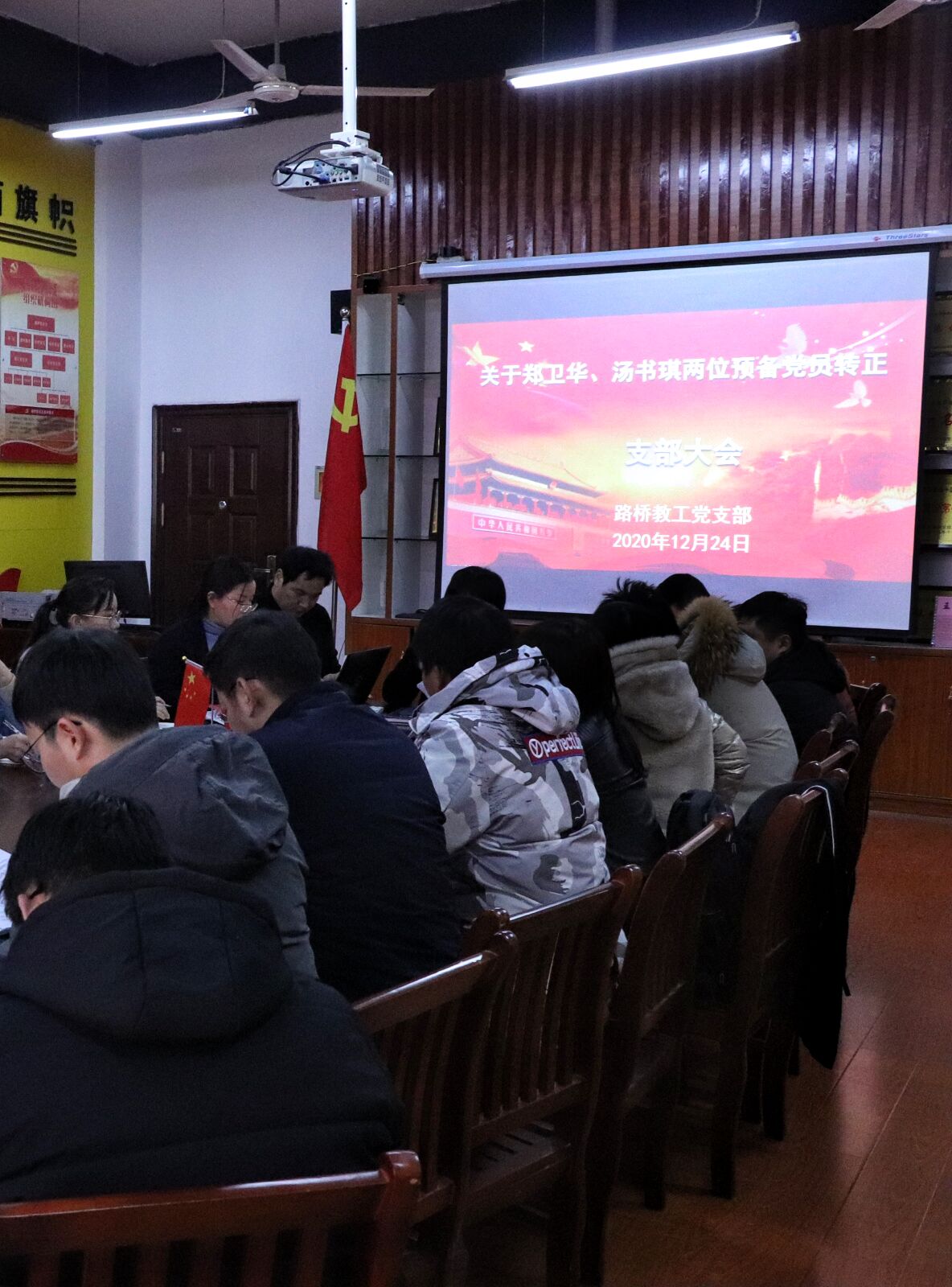 2020年12月24日,路桥教工党支部在交通工程中心党员活动室召开预备党员郑卫华和汤书琪两位同志的转正大会