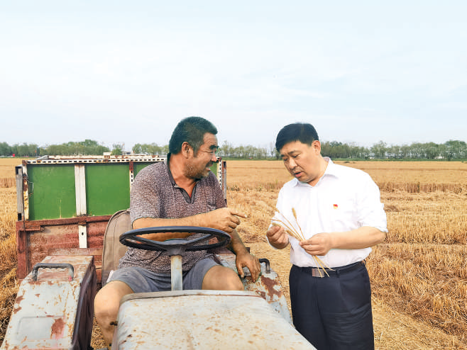 戴树胜(右)和群众交流,了解夏粮生产情况。