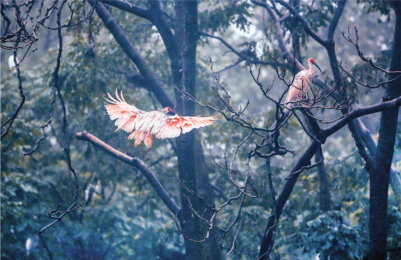陕西省汉中市洋县被称为“朱鹮之乡”。近年来,当地政府把涵养生态作为第一要求,出台一系列优惠政策,鼓励企业和合作社参与有机产业发展。如今,曾几近灭绝的朱鹮,从最初发现的7只繁衍到全球种群数量5000多只,其中洋县境内达2000多只,有机产业也成为带动贫困群众脱贫的主导产业。图为洋县陈家村附近归巢的朱鹮(2020年8月1日摄)。 新华社记者 兰红光/摄