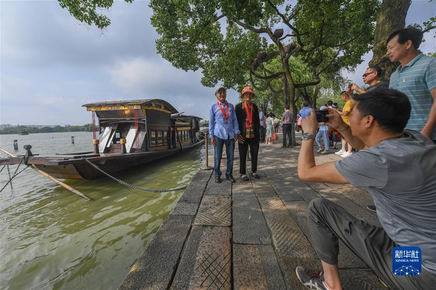 两名老党员在浙江嘉兴南湖湖心岛停泊的南湖红船旁拍照(7月1日摄)。