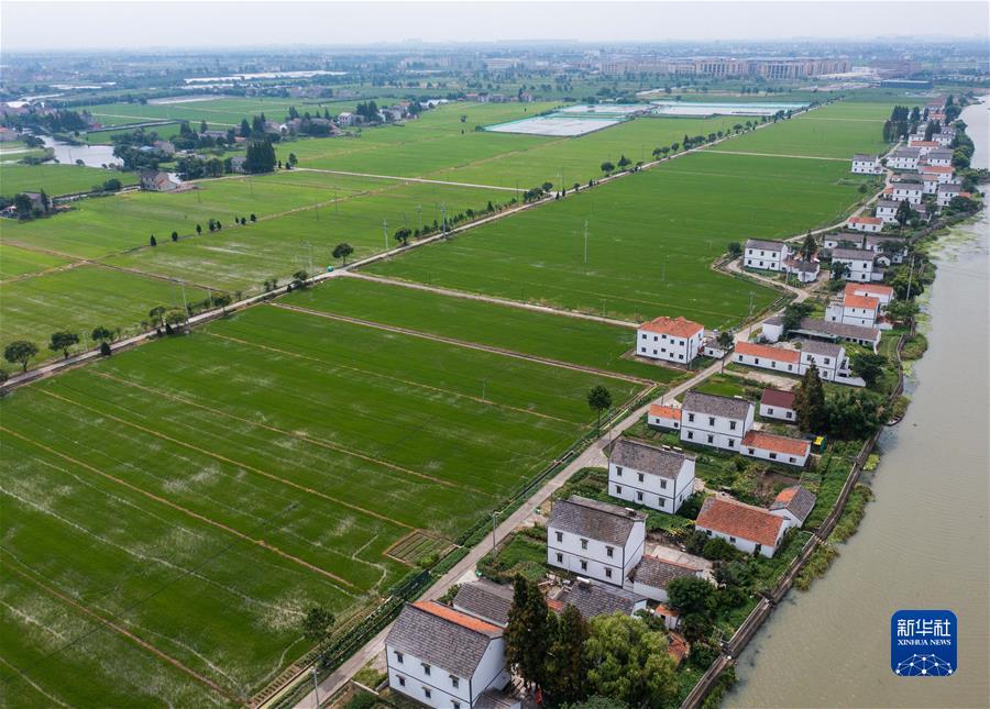 空中俯瞰浙江省嘉兴市嘉善县西塘镇红菱村的连片稻田和美丽村居(7月13日摄,无人机照片)。