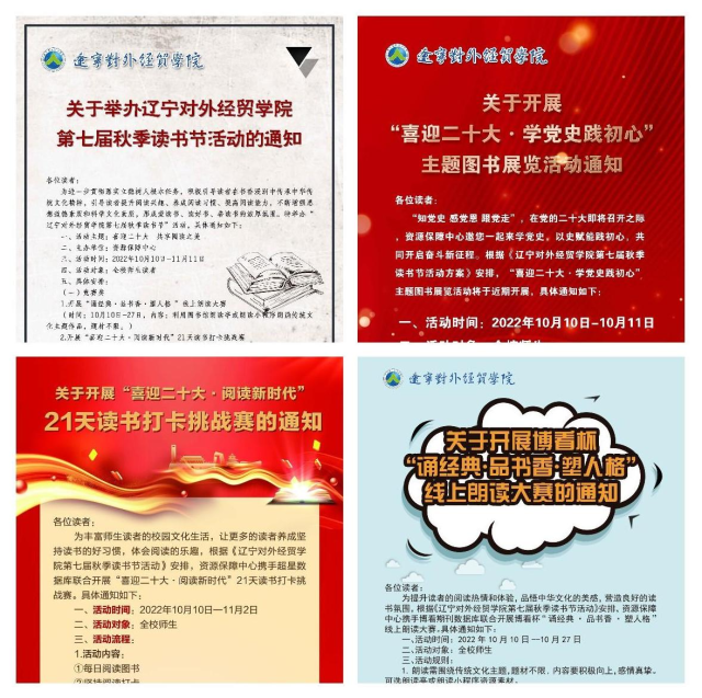 书香盛宴,精彩纷呈。本届读书节将历时一个月,以“喜迎二十大 共享阅读之美”为主题,陆续开展“诵经典 品书香 塑人格 ”线上朗读大赛、“喜迎二十大 阅读新时代”21天读书打卡挑战赛、知网杯“畅读校园抖出风采”抖音短视频创作大赛、第五届“中科杯 智赢未来 掌上英语”争霸赛、《论语》主题阅读宣传推广活动、馆藏图书书评征文活动、图书漂流以及图书展览等11项线上线下相结合的阅读推广活动。