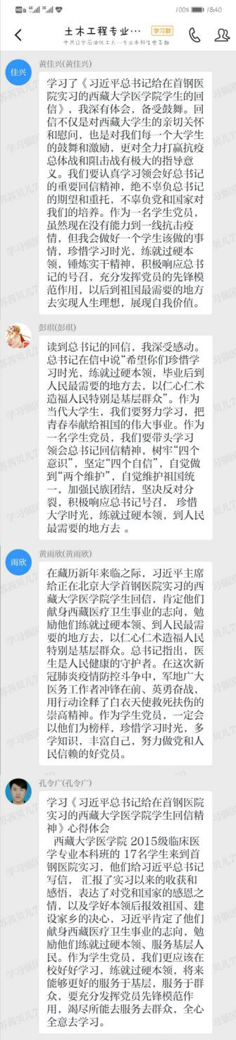 为深入学习贯彻习近平总书记给西藏大学医学院在首钢医院实习学生的回信中重要指示精神,牢记习近平总书记的殷切教诲,加强学生党员的思想建设。4月11日下午,石油天然气工程学院土木工程专业本科生党支部“云端”学习《习近平总书记回信勉励在首钢医院实习的西藏大学医学院学生》,全体支部党员参加,会议由支部书记宁璇主持。