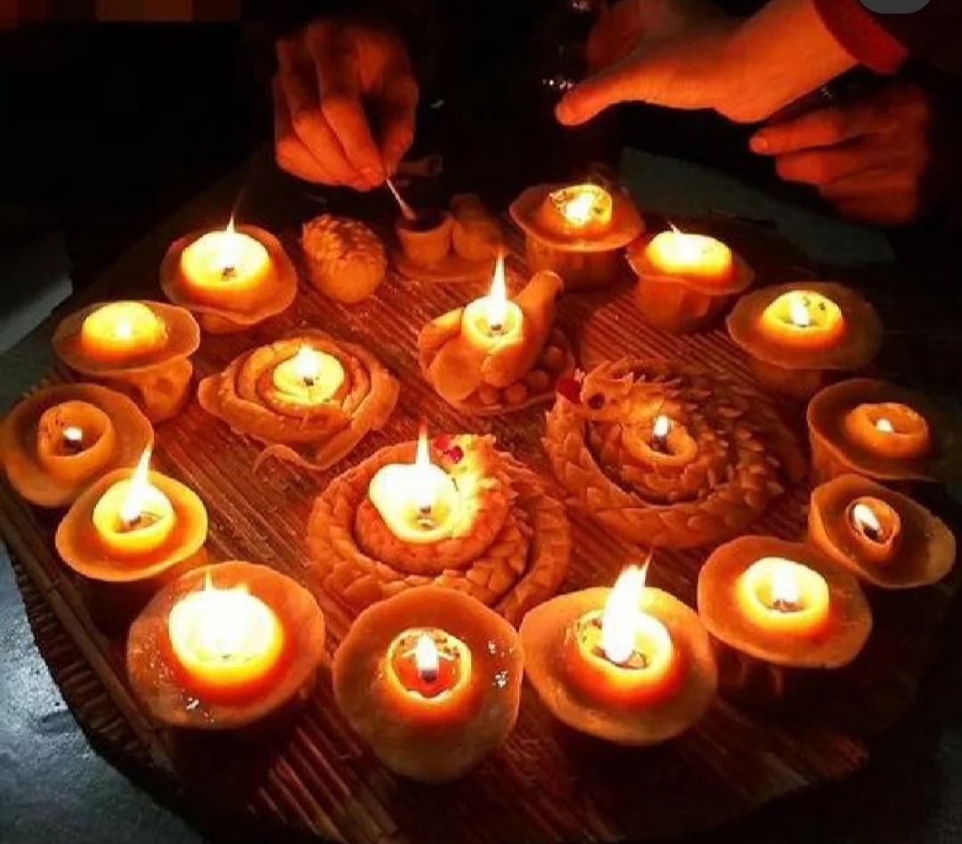 面灯是用面粉做的各种形式的灯盏,用食用油作燃料,多用谷物秸杆缠上棉花做灯芯。淮北地区的面灯上要捏出十二个褶子,对应着一年的十二个月,掀锅后,从灯里所蓄的蒸汽水推断月份的旱涝,预测年景。