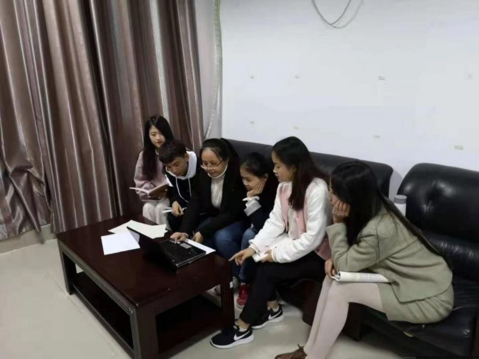 王媛老师(左三)指导赴印尼参加健康与领导力发展论坛同学们制作发言ppt
