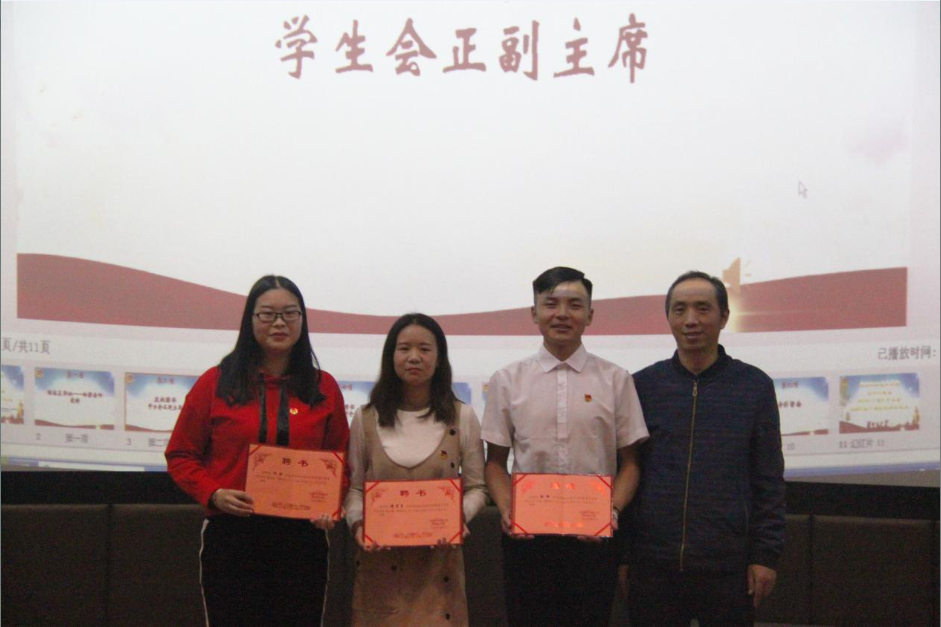 李天茂和郑静两位老师依次为2017级学生会正副主席、团支书副书记、协会正副会长、团总支各部门正副部长、学生会各部门正副部长颁发荣誉聘书并合影留恋。