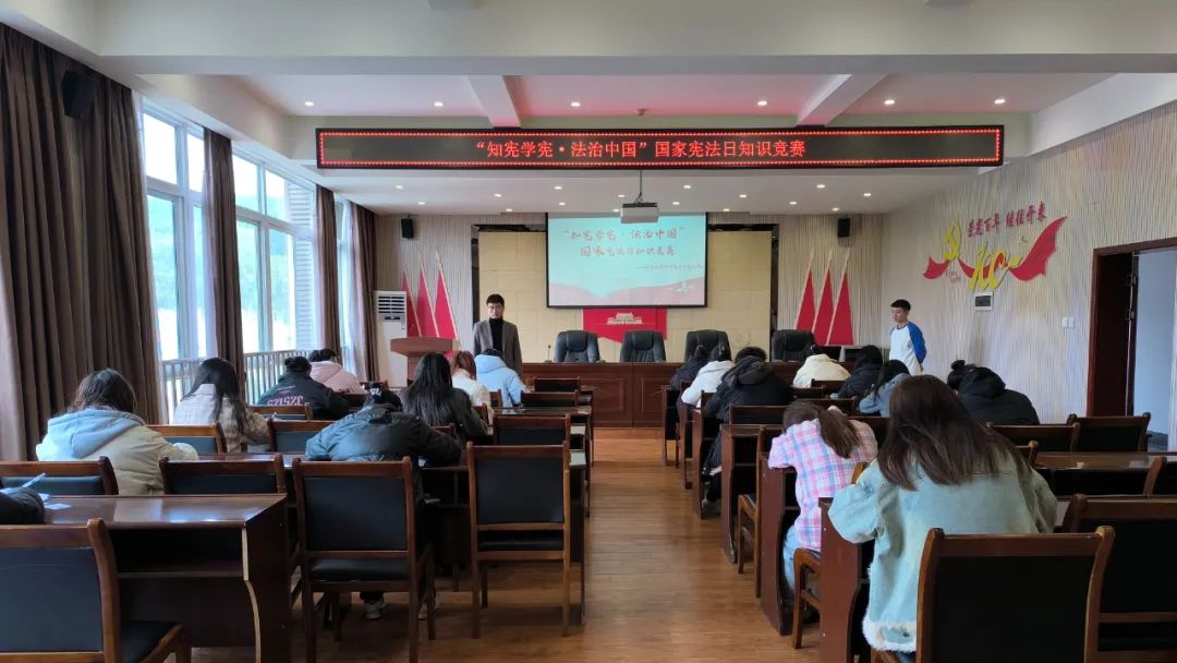 为深入开展学习贯彻习近平新时代中国特色社会主义思想主题教育,全面贯彻党的二十大精神,进一步增强入党积极分子的宪法意识和维护宪法权威的思想自觉、行动自觉。旅游与管理学院学生党支部于2023年12月15日在材料大楼A301开展“知宪学宪•法治中国”国家宪法日知识竞赛,本次竞赛共20名入党积极分子参加。