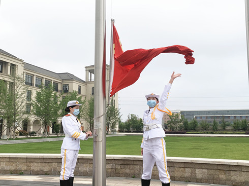 随着雄壮激昂的国歌奏响,鲜艳的五星红旗冉冉升起,全体庄严肃立行注目礼。