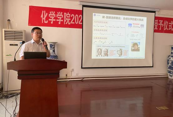 [化学学院 谢永发讯] 2021年7月19日上午,化学学院教职工第二党支部会同有机化学等课题组邀请了天津大学陈龙教授与中科院丛志奇研究员在理生楼A302报告厅开展了“担当作为学先进、争创佳绩做先锋”主题党日活动暨“智汇讲坛”报告活动。本次活动以党建引领,推进党建业务相互融合为目标,围绕学院科学研究这一中心工作,充分发挥党建对科研促进作用。教职工第二党支部成员,学院青年骨干教师,研究生共40余人参加了报告,化学学院党委委员、副院长谌烈主持了本次活动。