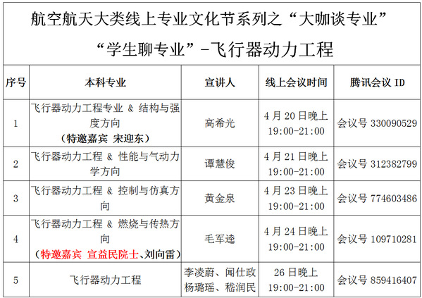 航空航天类专业文化节之飞行器动力工程专业线上讲座周安排