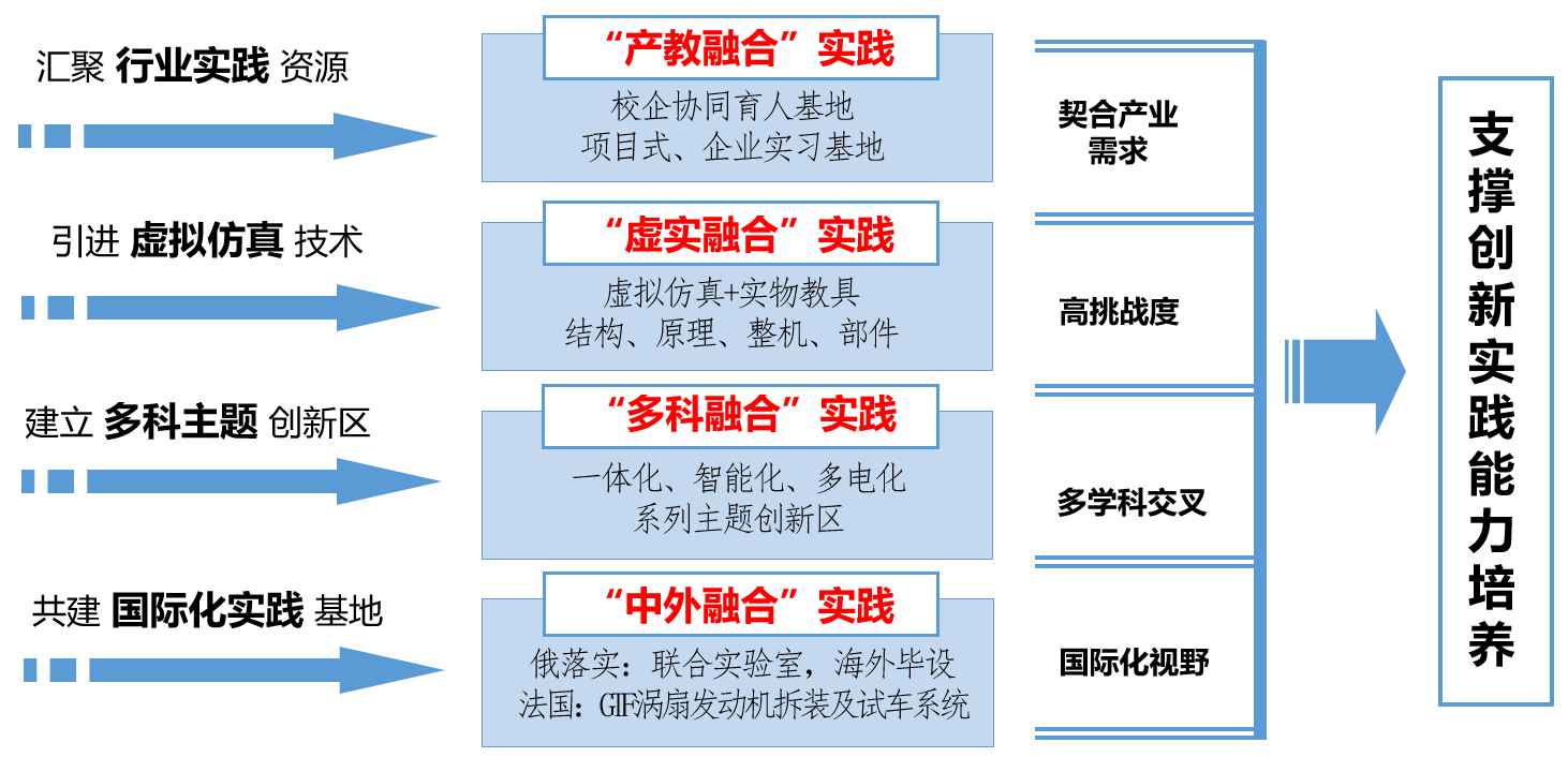 创新实践教学模式方面,本专业聚焦航空发动机产业发展,立足于航空发动机创新型人才的 “实践性、系统性、交叉性、前沿性”特质培养,创建了航空发动机国家级虚拟仿真示范项目、校企协同育人平台、多学科交叉主题创新区,与俄罗斯高校共建国际联合实践基地,提出了“产教融合、虚实融合、多科融合、中外融合”的“四融合”创新实践模式。通过“四融合”实践模式以加速提升学生在真实情境下的创新实践能力,提高了学生解决复杂系统工程问题的综合能力和高级思维能力。