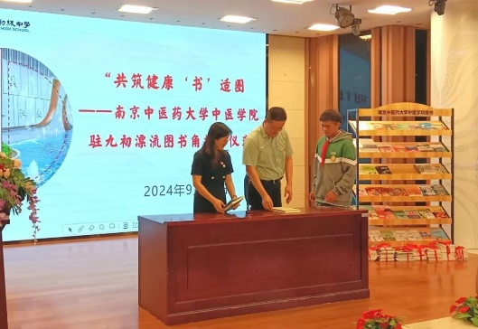 双方代表共同为漂流图书角揭牌,为本批赠书盖章,表达了对九初学子的殷切期望。