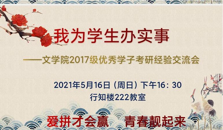 2021年5月16日,汉语言文学系、汉语国际教育系、秘书系共同策划的“文学院2017级优秀学子考研经验交流会”在行知楼222教室举行,会议的主题是:“爱拼才会赢,青春靓起来”。