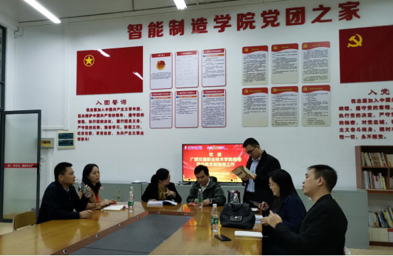 3月26日,广西交通职业技术学院党委副书记莫海燕等一行13人到我校开展工作交流,随后实地参观我院学生党团活动室,现场交流全国党建工作样板支部培育创建经验。我院学生党支部书记黄小钊、宣传委员麦文燕参与接待。