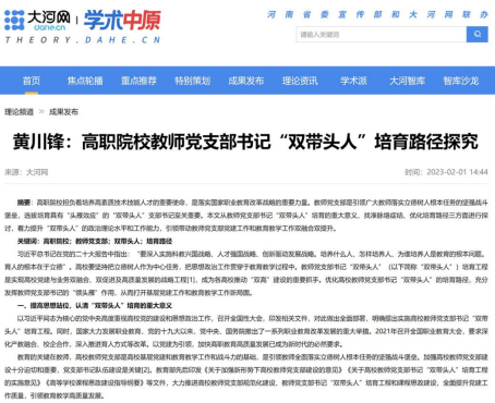 2023年2月1日,由中共河南省委宣传部主管、河南日报报业集团主办的《大河网》新闻网站刊发了我系《高职院校教师党支部书记“双带头人”培育路径探究》党建研究成果,此为2021年度河南省教育系统党建创新项目成果。
