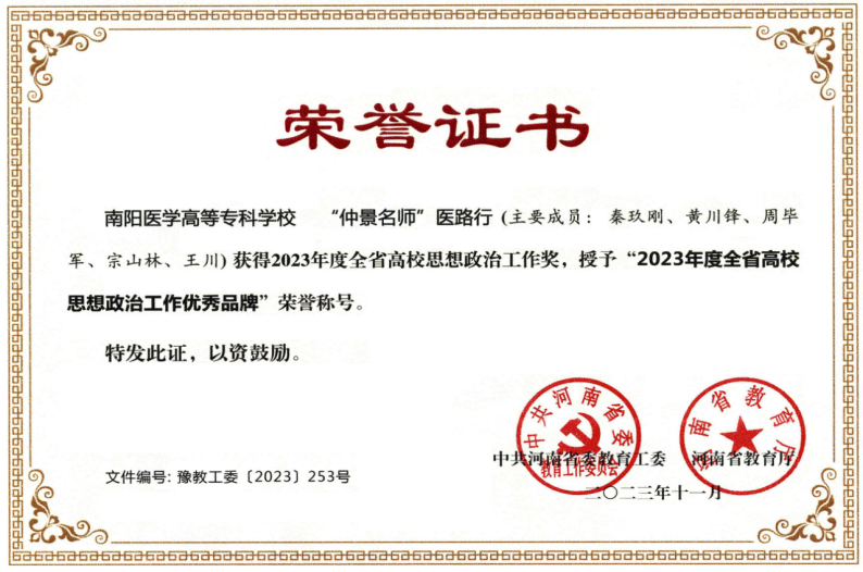 “仲景名师”党建品牌是地方“医圣”元素和基层党建的融合和创新,激励师生将传统的医师职责、使命和人民对美好生活的向往结合,和健康中国结合,和中华民族伟大复兴结合,赋予了“大医精诚”新的时代内涵,《“仲景名师”医路行》被评为2023年河南省高校思想政治工作优秀品牌。党建引领下“双带头人”教师党支部书记工作室、临床医学专业“双师型”名师工作室均获评省级工作室,成为教师发展和专业建设的强劲“引擎”。坚守为党育人、为国育才的初心使命,四维思政教育体系导向鲜明,推动“三全育人”取得显著成效。