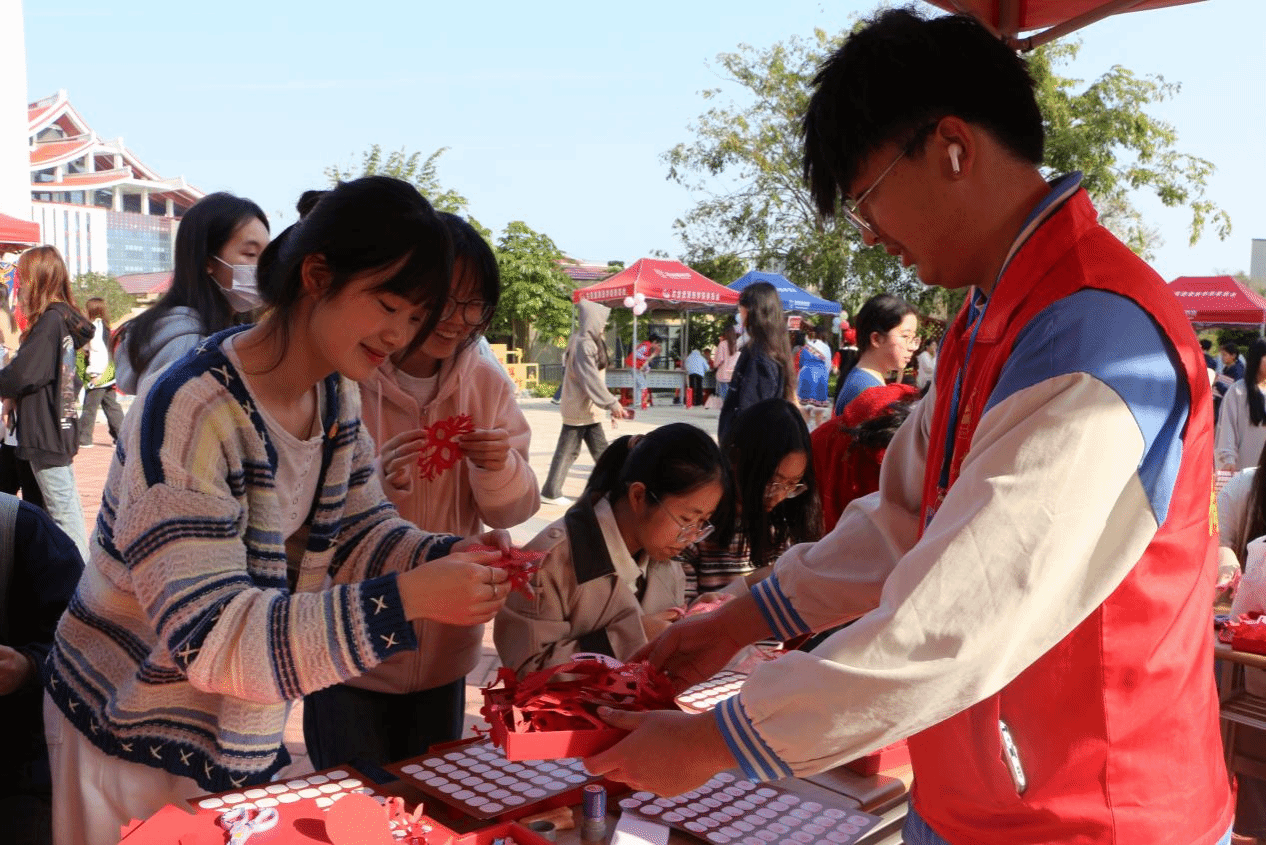 图为此次民族文化节现场,各民族学子正在体验、学习剪纸手艺。 汤茂振/摄