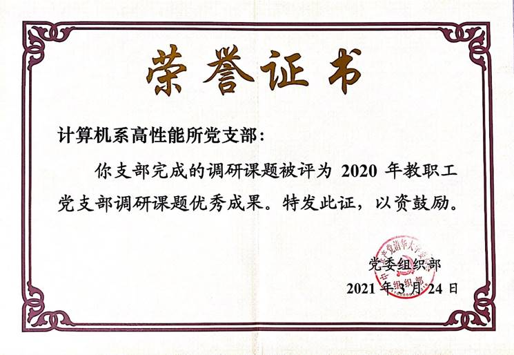 近日,清华大学计算机系高性能所党支部承担的《关于在“课程思政”建设中发挥专业引领的调研》的调研课题获得校党委2020年度教职工党支部调研课题“优秀成果”表彰。