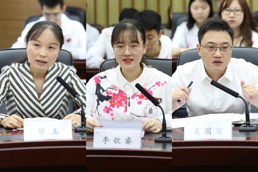 在座谈会上,校史馆馆长毕玉在发言中为大家讲述了江姐在川大的求学经历和革命事迹。在川大两年短暂而珍贵的求学时光丰富了她的知识、开拓了她的视野,磨砺了她的意志,为她日后的革命斗争工作奠定了坚实的基础。江姐班班长李歆睿同学在发言中表示,作为“江姐班”的学生,我们一定要传承革命先辈的崇高精神,坚定地当好红色传人,把自己的人生理想融入国家和民族的事业中,成长为又红又专、堪当民族复兴大任的时代新人,为实现中华民族的伟大复兴贡献青春和力量。马克思主义学院思政课教师吴国富在发言中表示,学高为师,身正为范。思政课教师并不只是一份职业,更是一份事业,思政课教师必须具有高度的责任心和强烈的使命感,深入学习和研究革命先辈的崇高精神,用心用情培养大学生成长为又红又专的时代新人。在川大的思政课教学中,老师们将革命先辈崇高精神感召和红色文化教育融入课程教学全过程,将红色基因深深植入学生的思想中,努力把学生培养成又红又专的时代新人。