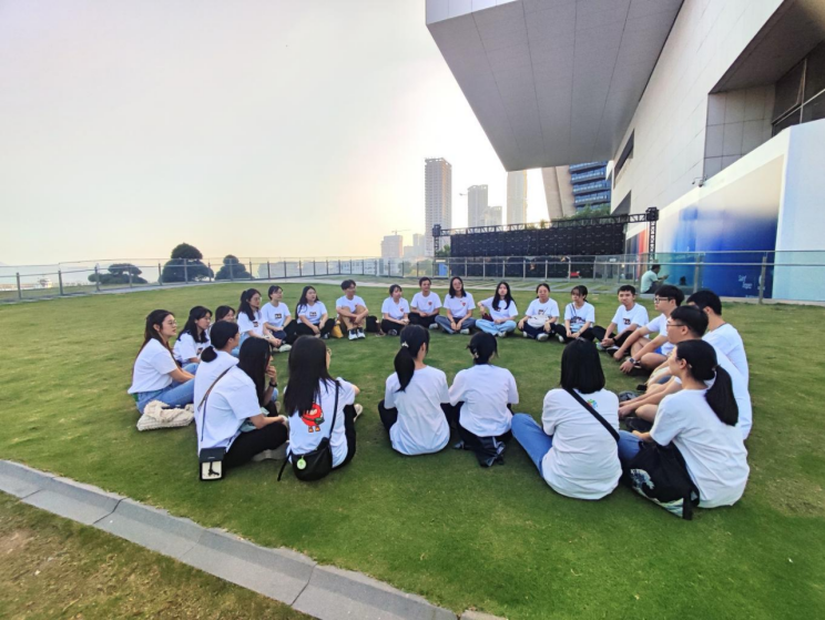 在场同学倍感振奋,怀着对袁庚先生的敬佩之情,大家在袁庚先生的雕像前合影留念,随后围坐在附近的草坪上畅谈自己的观展感受。