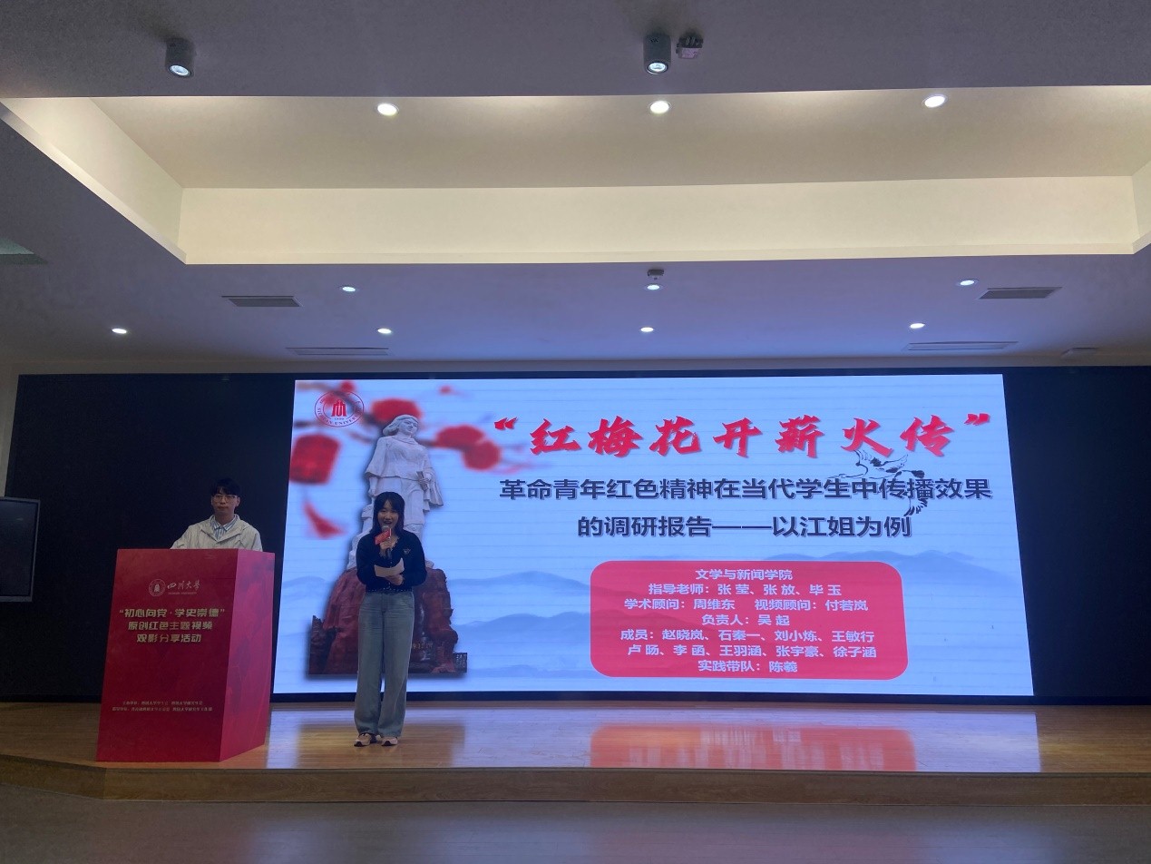 原创红色主题视频《红梅花开薪火传》以回溯江姐的生平的视角,结合实地调研路径的视角,探访了自贡江姐故居、重庆渣滓洞、四川大学。 “虽然江姐精神被不断挖掘发扬,但以往对江姐的介绍只有单一的革命烈士形象,她作为母亲、学姐的形象并没有得到全面展现。因此我们的视频从回溯江姐生平和重走其革命路线两大视角切入,提炼出江姐的三重形象:英勇的革命烈士、先进的学习工作者、患难托孤的母亲。最后将烈士精神和青年志气结合,展现出红色基因在新时代的体现与延续。”团队主创、文学与新闻学院2018级本科生吴起在视频播放结束后向在场观众解释了视频的创新性特点。