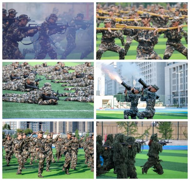 军营女孩铿锵玫瑰方队以矫健的步伐踩动铿锵的鼓点,用汗水与青春谱写了军营壮丽之歌,一身军装更显巾帼英姿。盾牌操方队一招一式,刚劲有力,一攻一守,气势磅礴,体现出山大学子守护祖国的责任与担当。刺杀操方队一突一刺,一防一击,尽显山大男儿时代风采。旗语操方队身着迷彩,手握旗帜,传递山大学子浓厚的家国情怀。擒敌拳方队刚劲有力、斗志昂扬,充分展现出山大学子强健的体魄和立志成为国家栋梁的决心。特战方队用多变的射击姿势,流畅的战术动作和精彩的特战行动展现出战士的勇敢和军人的刚毅。红旗飘飘方队旌旗飞舞,带着满腔热情舞出新一代青年“青春有为,强国有我”的坚定信念。