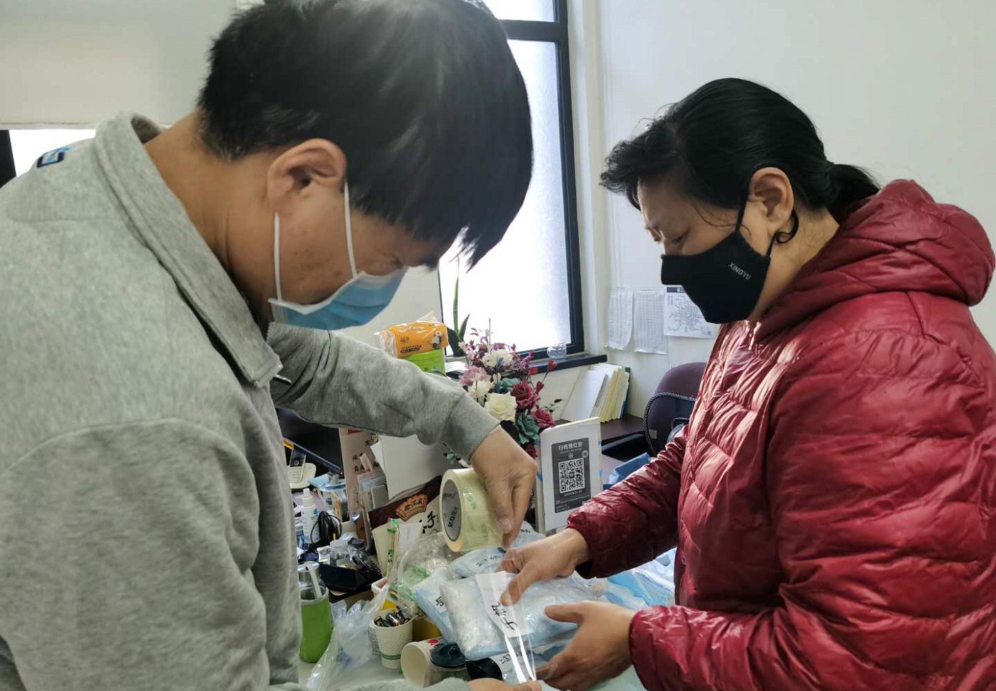 学院工会主席邱文、院办公室杨国志老师,细心的为140名教职工包装好口罩,并根据老师们的需求分别将口罩放置在老师的个人信箱及值班室,供老师们领取。