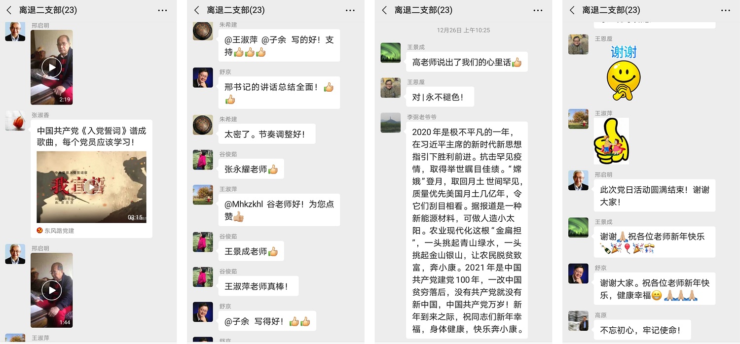 2020年12月26日上午,初教院离退休第二党支部召开了“回顾与展望”网上专题党日活动。支部31名党员中,除去不能在家上网的少数几人外,有24人参加了会议。支部书记邢启明老师对一年来,支部工作和党员同志们以饱满的政治热情积极参加理论学习、战疫情、捐献特殊党费,参加社区服务、垃圾分类以及学院老干部工作的情况进行了总结,然后党员们自由发言。